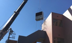 先日、病院のエアコン空調機械・入れ替え工事の引取りに行って来ました。天気は秋晴れ・大型クレーンでの作業でしたよ